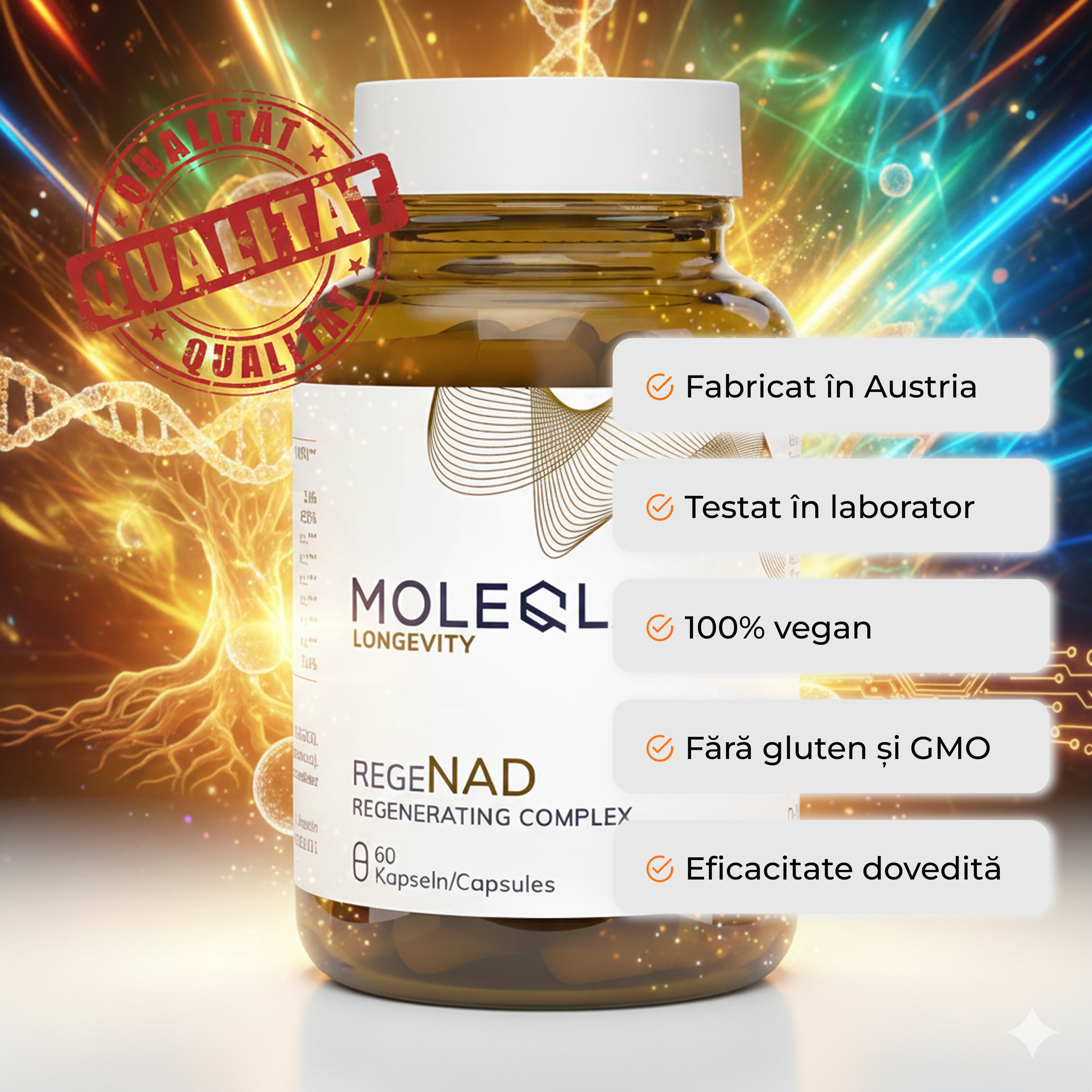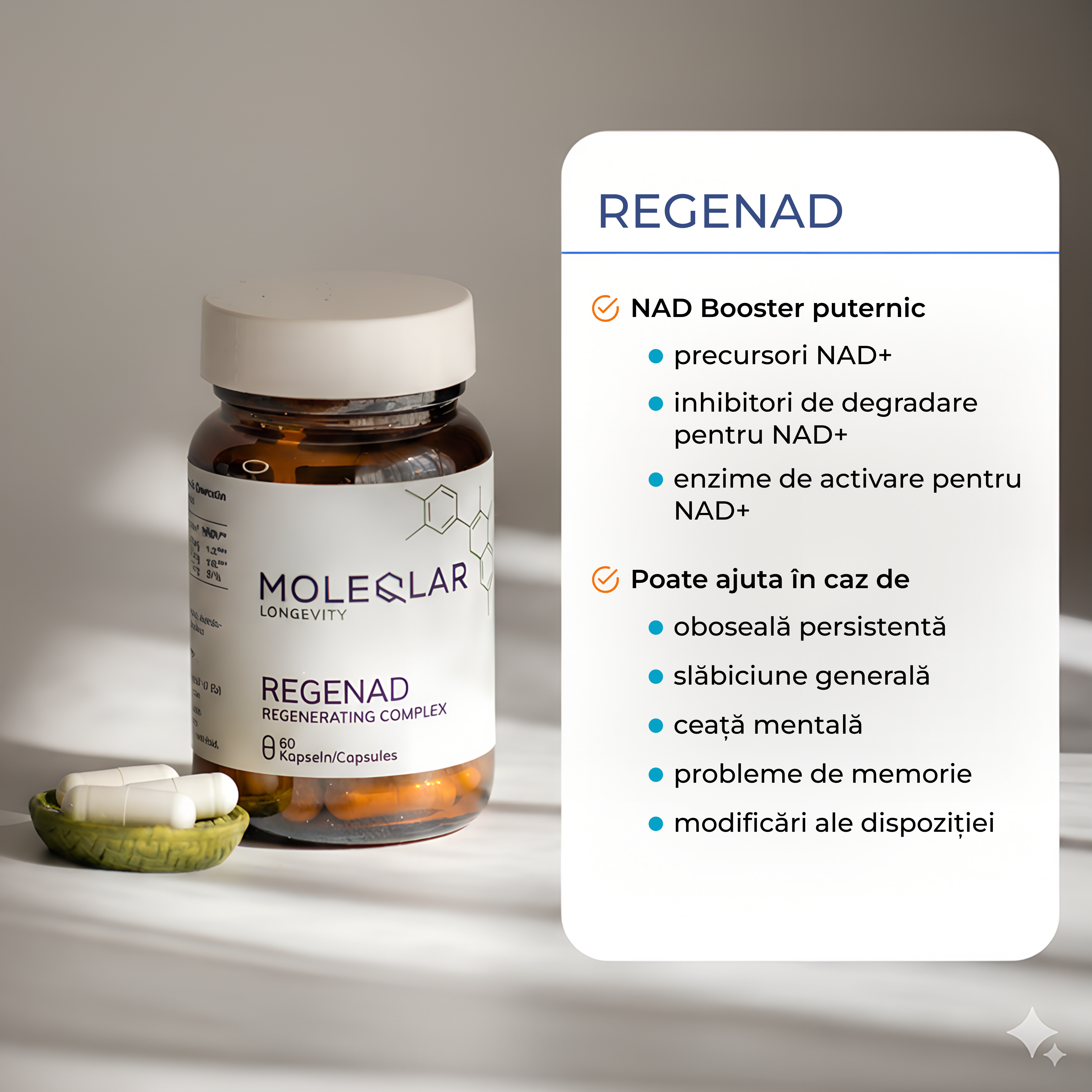 - NAD Booster: precursor NAD+ (nicotinamidă adenină dinucleotidă), o moleculă cu rol în producerea de energie, repararea ADN-ului și reglarea expresiei genelor.